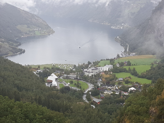 높은 언덕에서 내려다 보이는 게이랑에르의 풍광은 너무나 아름다와라, 비가 오고 안개가 끼인 게이랑에르이지만 많은 사람들로 뷰를 감상하고 사진을 찍느라 분주하다. 우리도 질세라 우산을 쓰고 사진을 찍고 감동의 가슴을 안고 아래쪽 유람선을 타러 갔다.